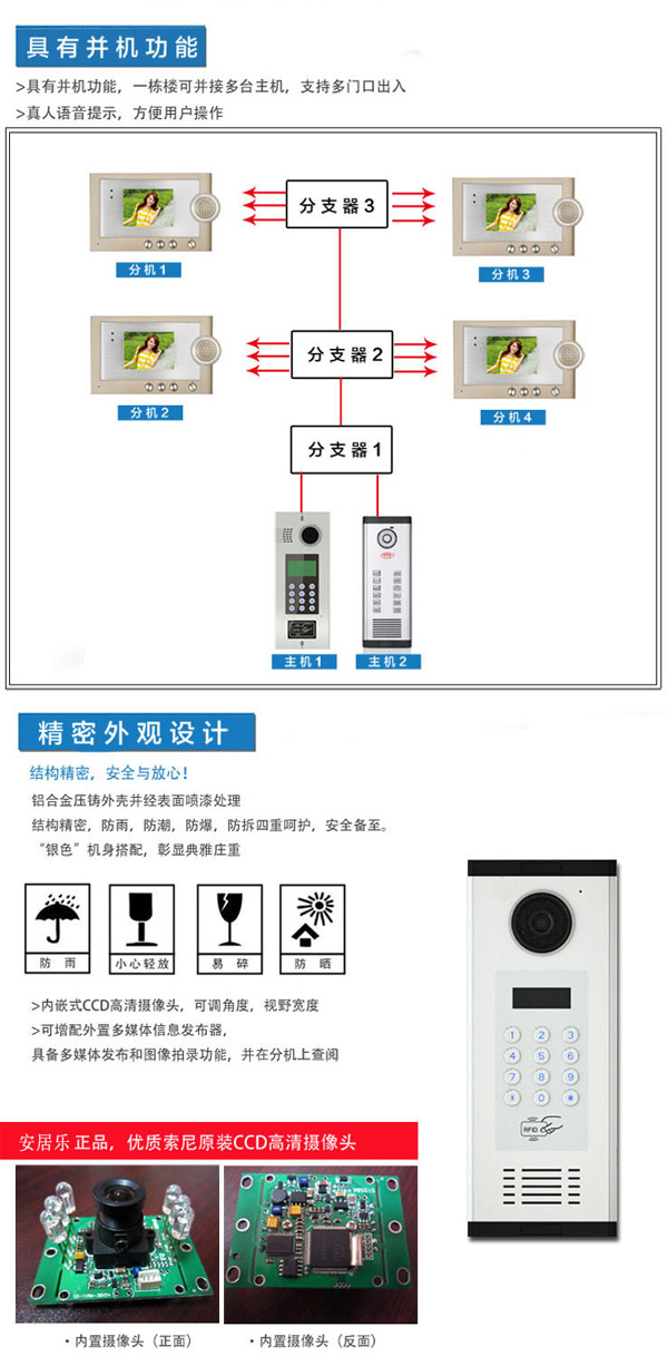 內置CCD高清攝像頭,可設置密碼開鎖,上電與斷電兩種開鎖方式可選,鑲門或嵌墻安裝