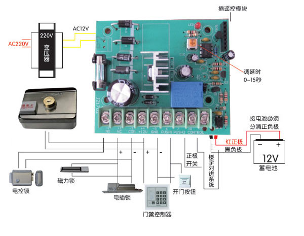 注意!接電控鎖時必須把延時調到0秒,以防止燒壞電控鎖線圈。